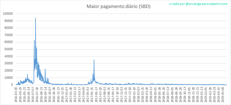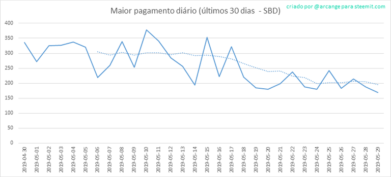 Este gráfico mostra o máximo de recompensa pago por um post (ou comentário), em cada dia (durante todo funcionamento da blockchain e os últimos 30 dias)