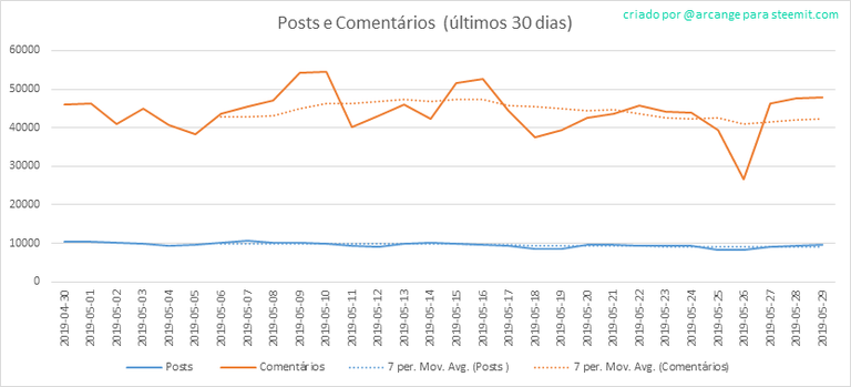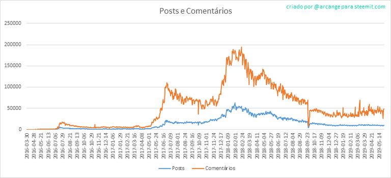 Esses gráficos mostram a evolução dos posts e comentários desde o início da blockchain e dos últimos 30 dias.