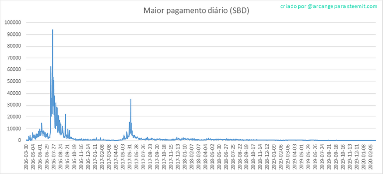 Este gráfico mostra o máximo de recompensa pago por um post (ou comentário), em cada dia (durante todo funcionamento da blockchain e os últimos 30 dias)