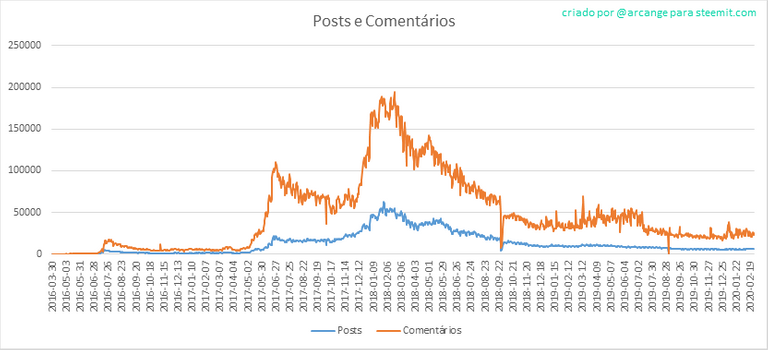Esses gráficos mostram a evolução dos posts e comentários desde o início da blockchain e dos últimos 30 dias.