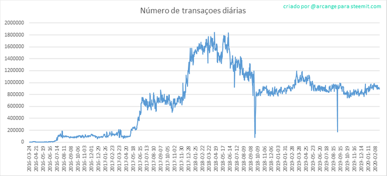 Este gráfico mostra o número de transações diárias. Isto dá uma ideia de toda atividade na blockchain.