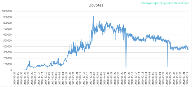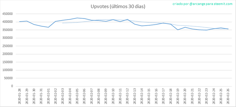 Esses gráficos mostram a evolução da curadores (upvotes) desde o início do funcionamento da blockchain e dos últimos 30 dias.