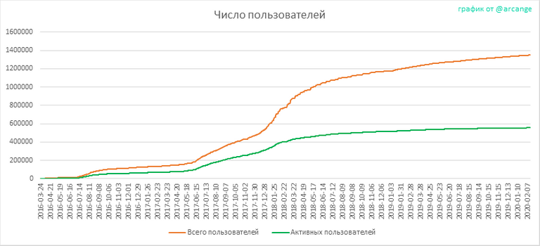 Этот график показывает количество новых пользователей, зарегистрированных на Steem и сколько из них стали активными. Мы видим, что многие пользователи зарегистрировали аккаунты, но они никогда не используются.