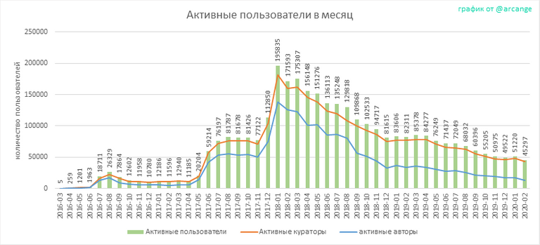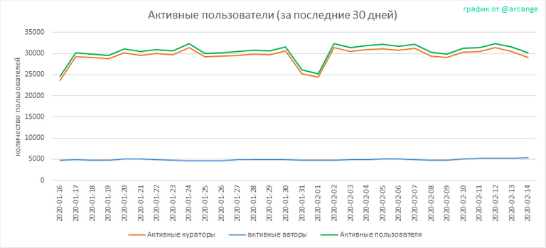 Зеленая линия показывает, сколько пользователей были активны, по крайней мере, один раз ("активный пользователь", означает, что он написал по крайней мере одно сообщение, комментарий или проголосовал). Активный пользователь включается в график, даже если позже он становится неактивным.