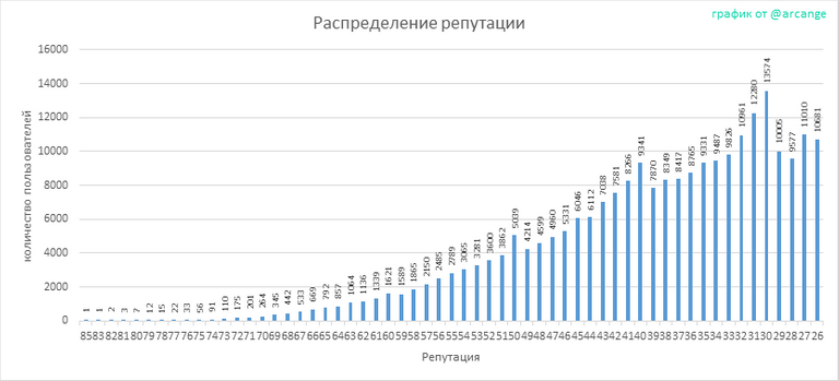 Этот график показывает распределение репутации среди пользователей. Пользователи с репутацией ниже 25 были удалены, чтобы график был читаемым.
