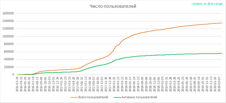 Этот график показывает количество новых пользователей, зарегистрированных на Steem и сколько из них стали активными. Мы видим, что многие пользователи зарегистрировали аккаунты, но они никогда не используются.