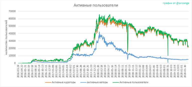 Зеленая линия показывает, сколько пользователей были активны, по крайней мере, один раз ("активный пользователь", означает, что он написал по крайней мере одно сообщение, комментарий или проголосовал). Активный пользователь включается в график, даже если позже он становится неактивным.