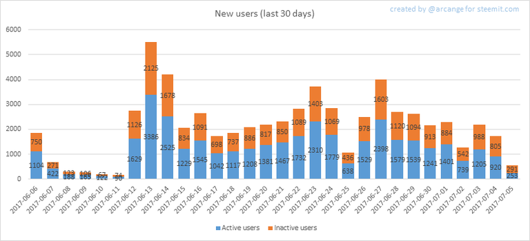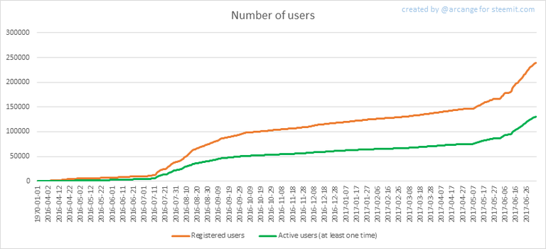 This chart shows the number of newly registered users on Steemit and how many of them became active. We see that a lot of accounts are registered, but never used.