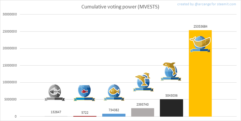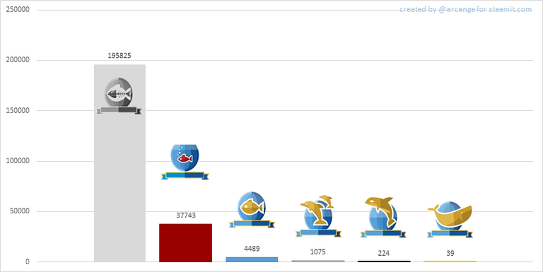 This graph shows the number of users according to their voting power (it now includes the new "Inactive" and "Red Fish" levels - check @steemitboard blog for more info about this).