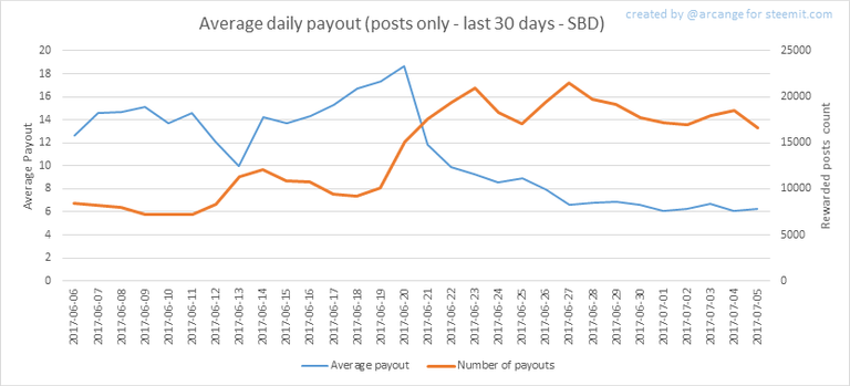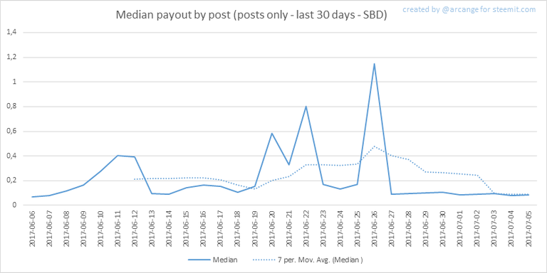 These graphs show the average and median payout per post for the last 30 days.
