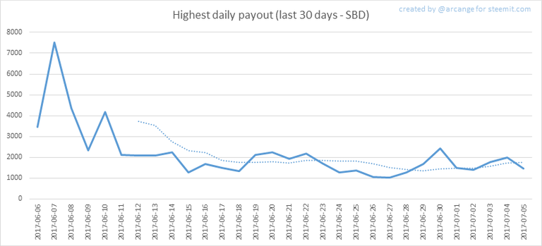 These graphs show the maximum reward paid on a post (or comment) for each day (whole blockchain life and last 30 days).