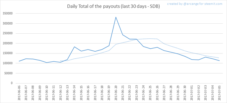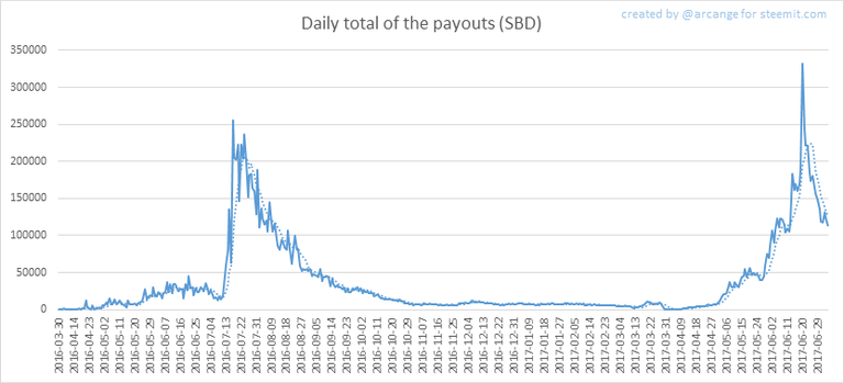 These graphs show the total of the distributed payout (posts and comments) for each day.