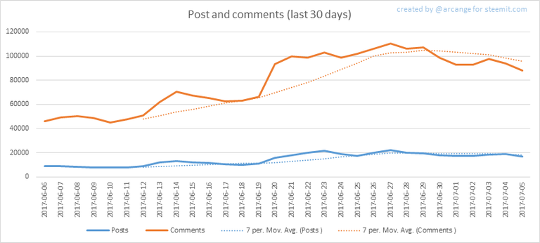 These graphs show the evolution of posts and comments for the whole blockchain lifetime and for the last 30 days.
