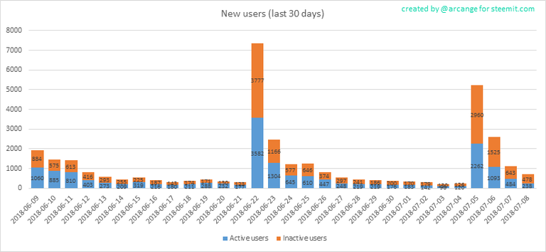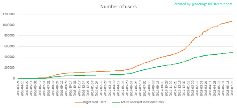 This chart shows the number of newly registered users on Steemit and how many of them became active. We see that a lot of accounts are registered, but never used.
