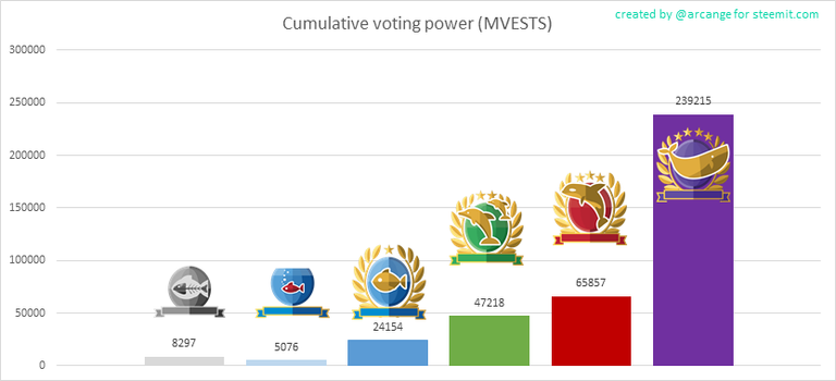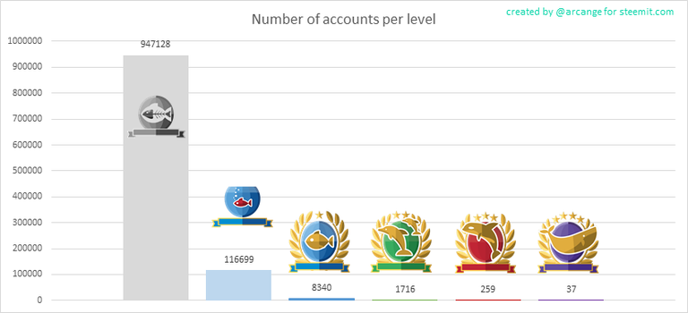 This graph shows the number of users according to their voting power (it now includes the new "Inactive" and "Red Fish" levels - check @steemitboard blog for more info about this).