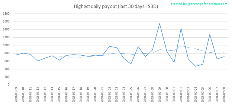 These graphs show the maximum reward paid on a post (or comment) for each day (whole blockchain life and last 30 days).