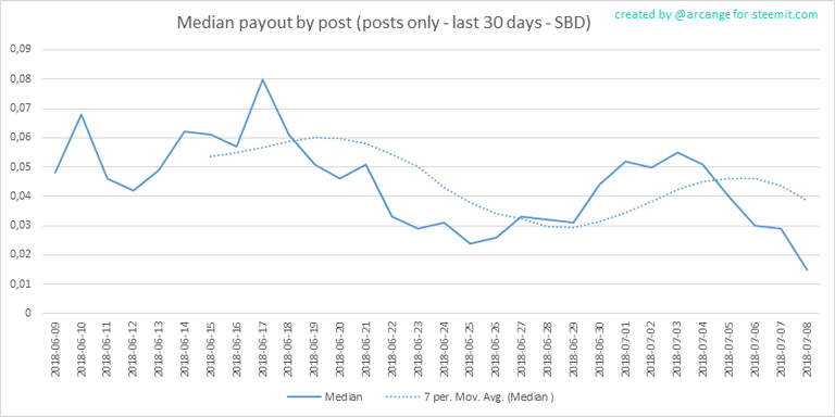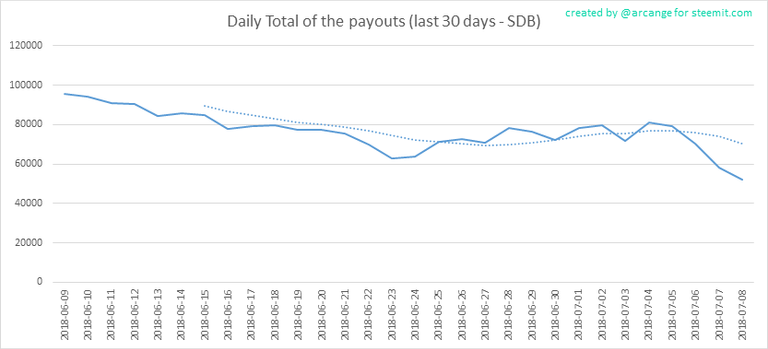 These graphs show the total of the distributed payout (posts and comments) for each day.