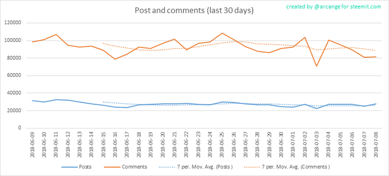 These graphs show the evolution of posts and comments for the whole blockchain lifetime and for the last 30 days.