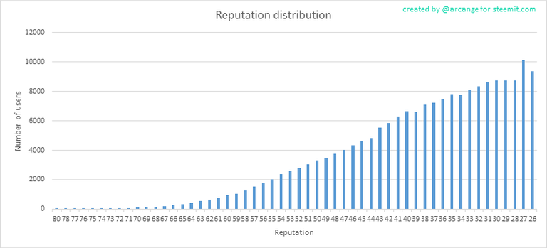 This graph shows the distribution of the reputation among users. Accounts with a reputation lower than 25 have been removed to keep the graph readable.
