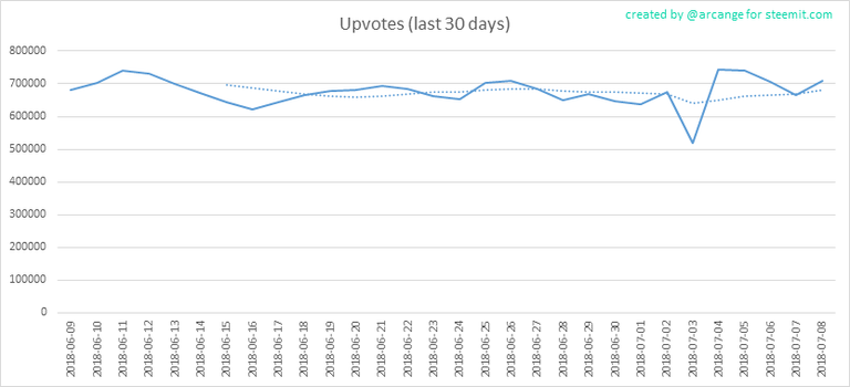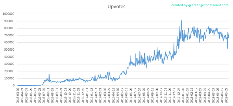 These graphs show the evolution of curation (upvotes) for the whole blockchain lifetime and for the last 30 days.