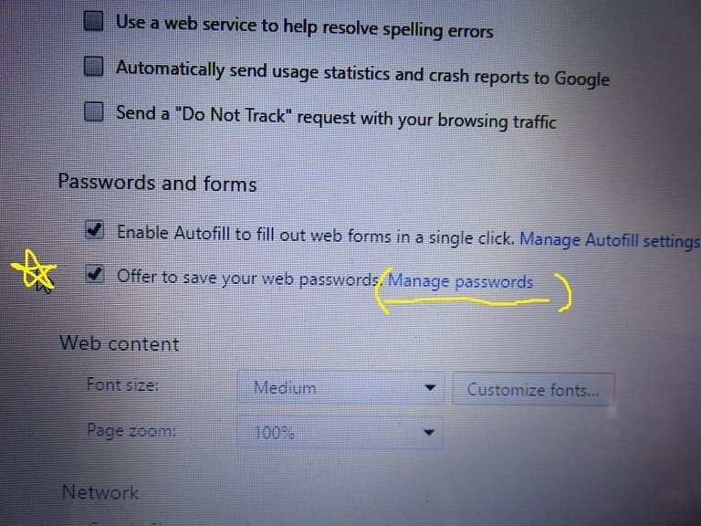 4-After clicking on "show advanced settings" another list will come up. Find the section in this list that says "Passwords and Forms". Click on the button "Manage Passwords" in this section. Example in the picture below