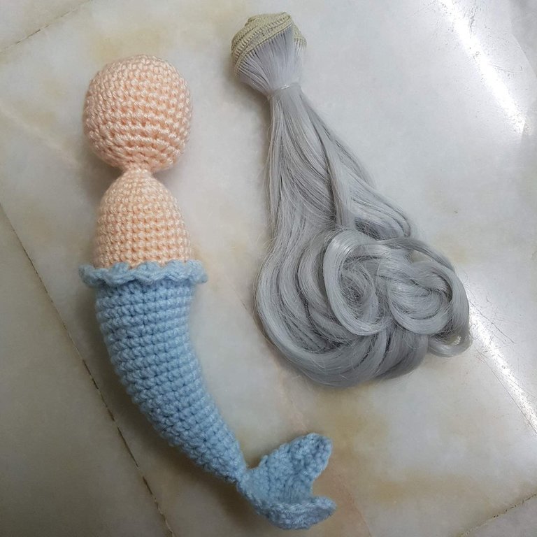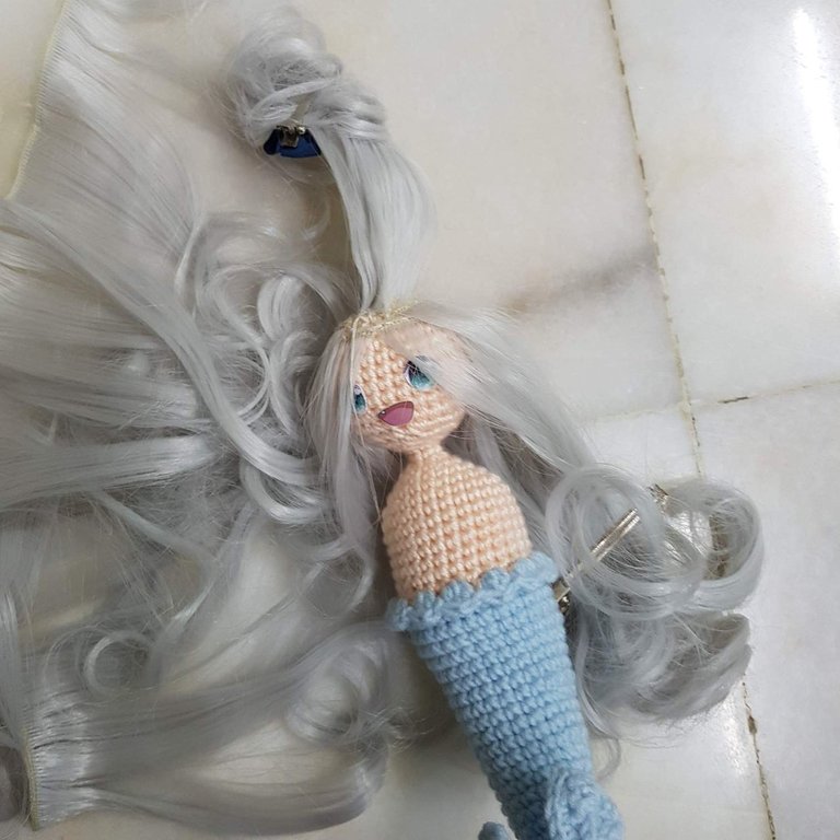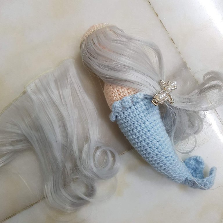 实在太过兴奋了,收到了期待已久的娃娃假发! 😊😊😊 网上有卖现成一顶的,价格比较贵,有限制头的尺寸。于是,我买的假发是一排的,价格比较便宜,可以自己制作各种尺寸。我选了灰色卷发给我的美人鱼娃娃。