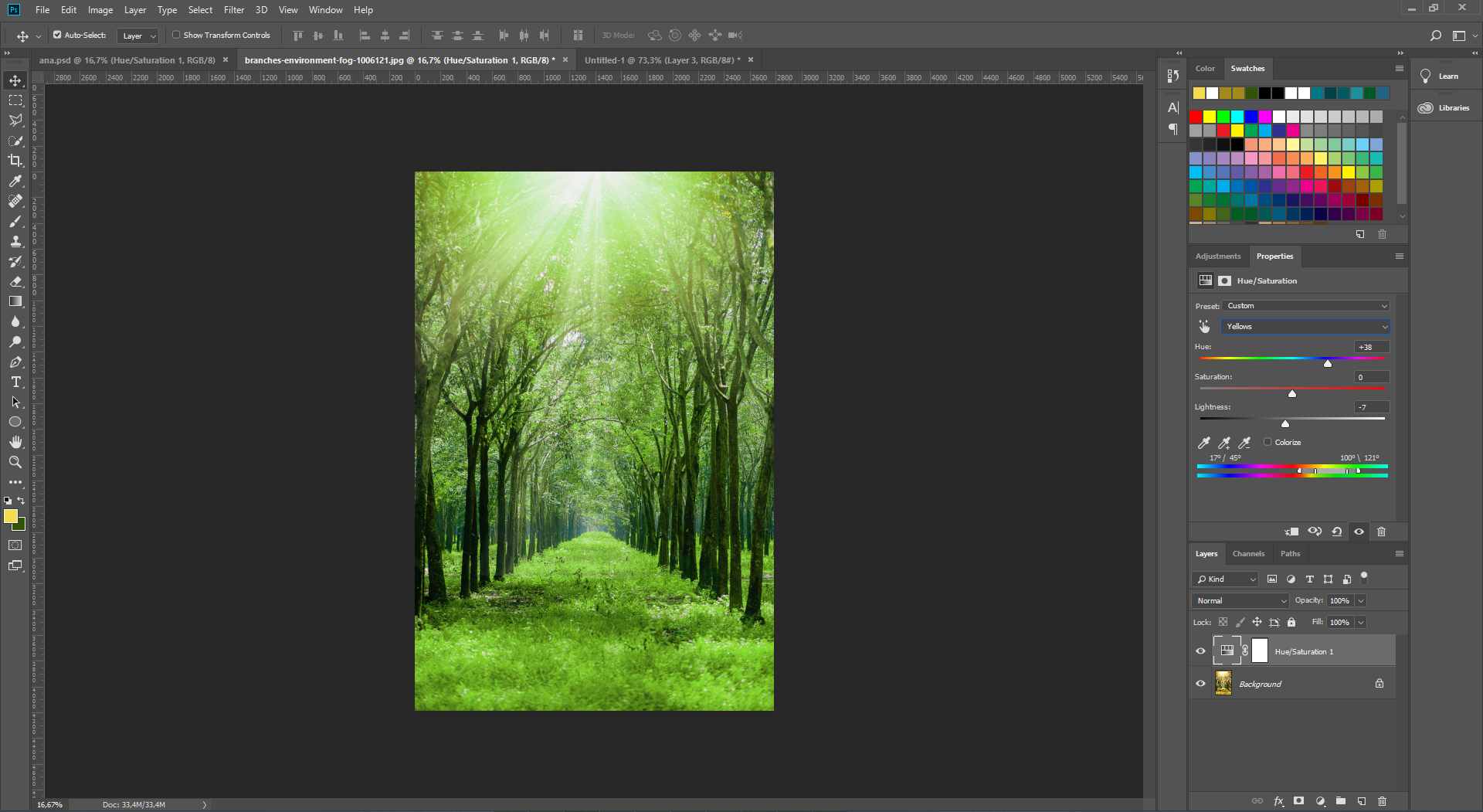 We need to adjust yellowish/orange grass to a green. So change the Hue/Saturation settings from Master to Yellows.