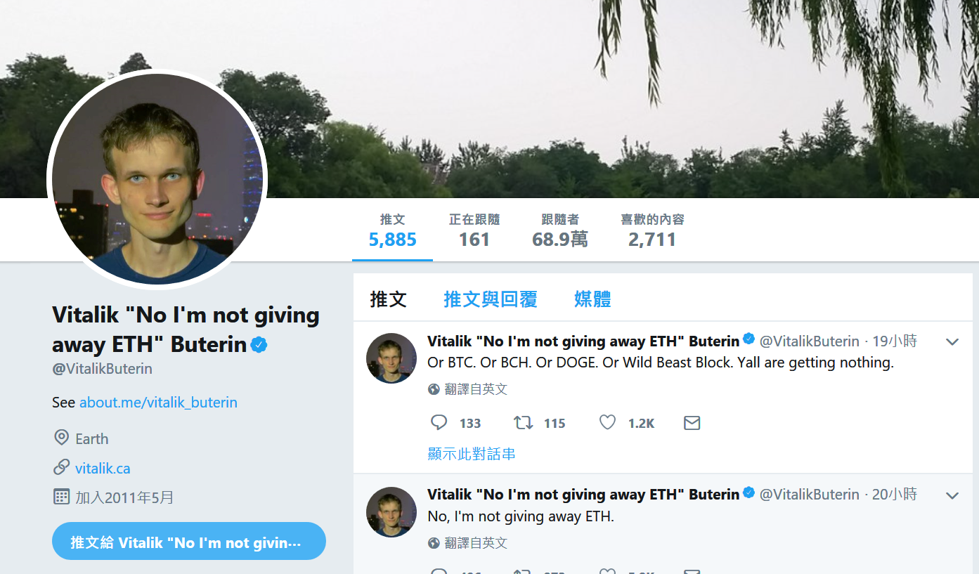 阿哈哈!大家快去看!整個 V 神的推特,都在對抗這個以太幣詐騙,看來跟我一樣被騙的人一定很多。你看 V 神連帳號的 slogan 都改成了 "No I'm not giving away ETH",哈哈。