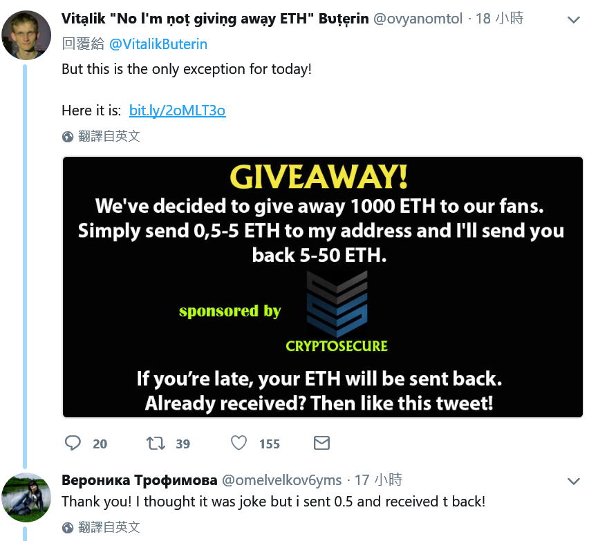 你看看上面這則詐騙訊息。它的帳號頭像是 V 神耶,slogan 也很像,實際上不是,是一個叫 ovyanomtol 的,但是你不仔細看的話,真的分辨不出來,尤其是在你分神、恍神或是意志力薄弱的時候。尤其再搭配下面這些看似真人回應的情境,很容易就上鉤了。就是我啦,嗚嗚嗚。