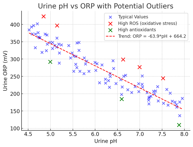 In real urine studies, pH and ORP shows a moderate negative correlation of ~–64 mV per unit pH. Deviation of urine ORP from the trendline can add unique insights by indicating the presence of high ROS (due to infection or dietary intake) or high antioxidants.