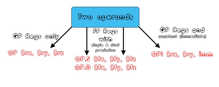 The operands of an arithmetic expression can be stored inside of GP or FP registers, or be constants that are taken as immediate values, and so we can summarize two operands as