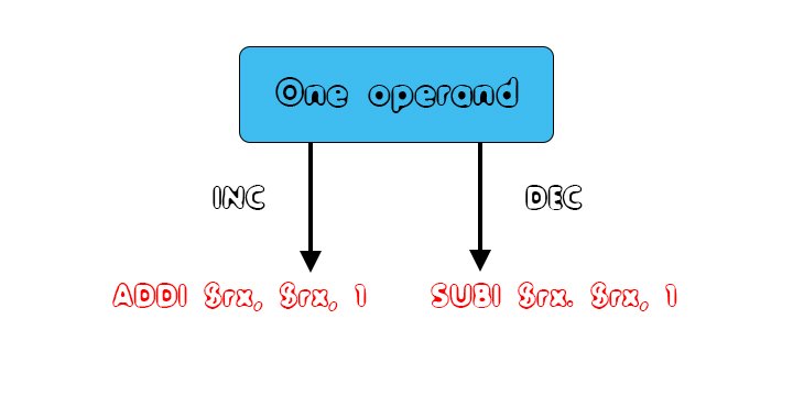 In our language we also have arithmetic operations that are used for incrementing and decrementing values. Those operations can be easily translated into ADDI or SUBI instructions. Thus, the one operand cases of arithmetic operations are: